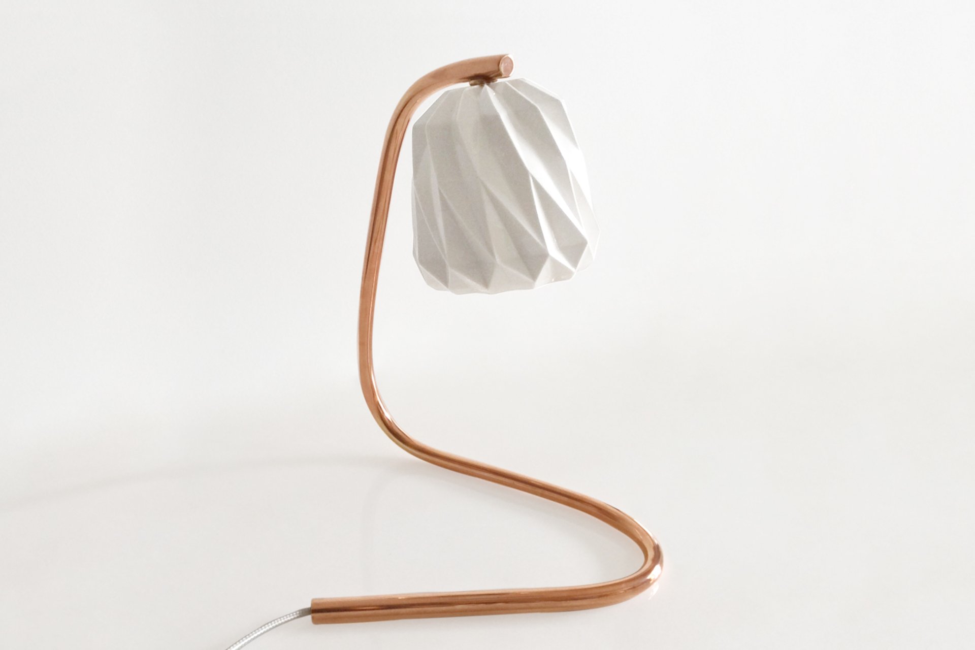 Table lamp that combines two different materials, its twisted metal base transmits a fluid visual dynamic ending in an interesting contrast with the rigidity of the porcelain’s edges on the abat jour’s end points.